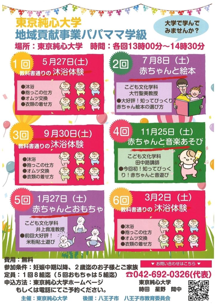 | 開催日 | 1回 :2023年 5月27日(土) 教科書通りの沐浴体験 2回 :2023年 7月8日(土) 赤ちゃんと絵本 3回 :2023年 9月30日(土) 教科書通りの沐浴体験 4回 :2023年 11月25日(土) 赤ちゃんと音楽あそび (講師:田中路講師) 5回:2023年 1月27日(土) 赤ちゃんのおもちゃ (講師:井上准教授) 6回:2024年 3月2日(土) 教科書通りの沐浴体験 |