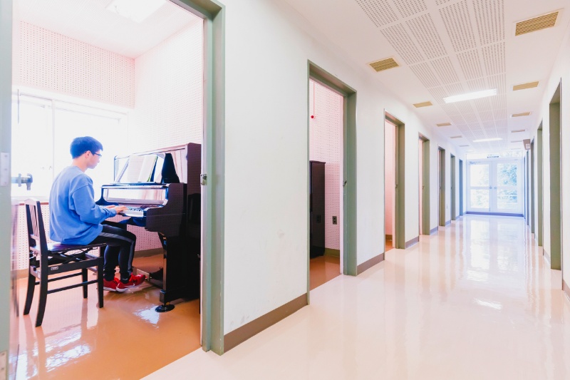 ピアノ練習室の部屋数は20室あります。防音装置を完備した完全個室に、全ての練習室に1台ずつアップライトのピアノを設置しています。こども文化学科では全学年を通して専門科目に「ピアノ表現法」の授業があります。東京純心大学では、個人練習室を自由に使えるので、自宅にピアノがなくても安心です。