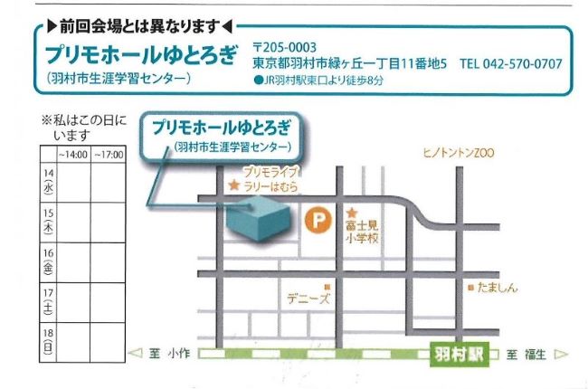 場所:羽村市生涯学習センター プリモホールゆとろぎ小ホール 入場無料