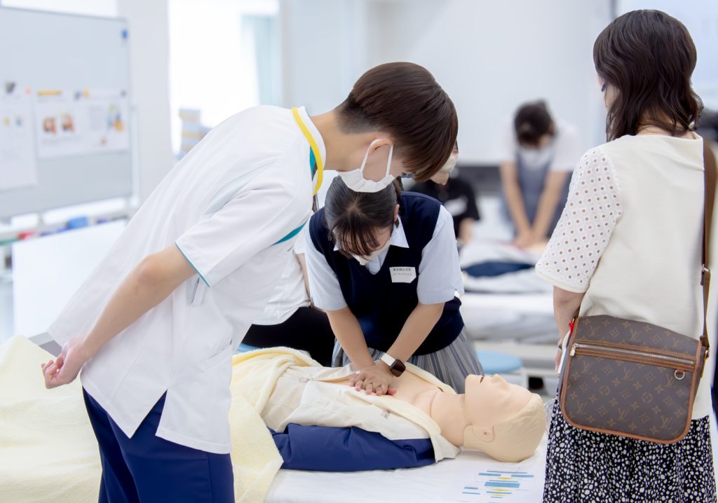 看護学部のオープンキャンパスでは、「片麻痺体験」、「BLS(一次救命処置)」といった看護体験や、「学内ツアー」「在学生と話そう」など在学生主催のプログラムを実施。