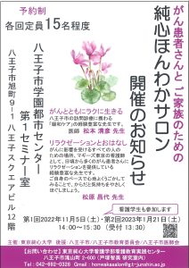 | 内容 | 「がんとともにラクに生きる」医師 松本清彦先生 八王子市の訪問診療に携わる「緩和ケア」の経験豊富な先生による講演です。 「リラクゼーションとおはなし」松原 昌代先生 がんに影響を受けるすべての人のための場所、マギーズ東京の看護師として、日頃から多くのがん患者さんにリラクゼーションを提供している経験豊富な先生です。 ご自身のペースで心地よくうごかしてみることで、からだと気持ちをやさしくほぐしましょう。 |