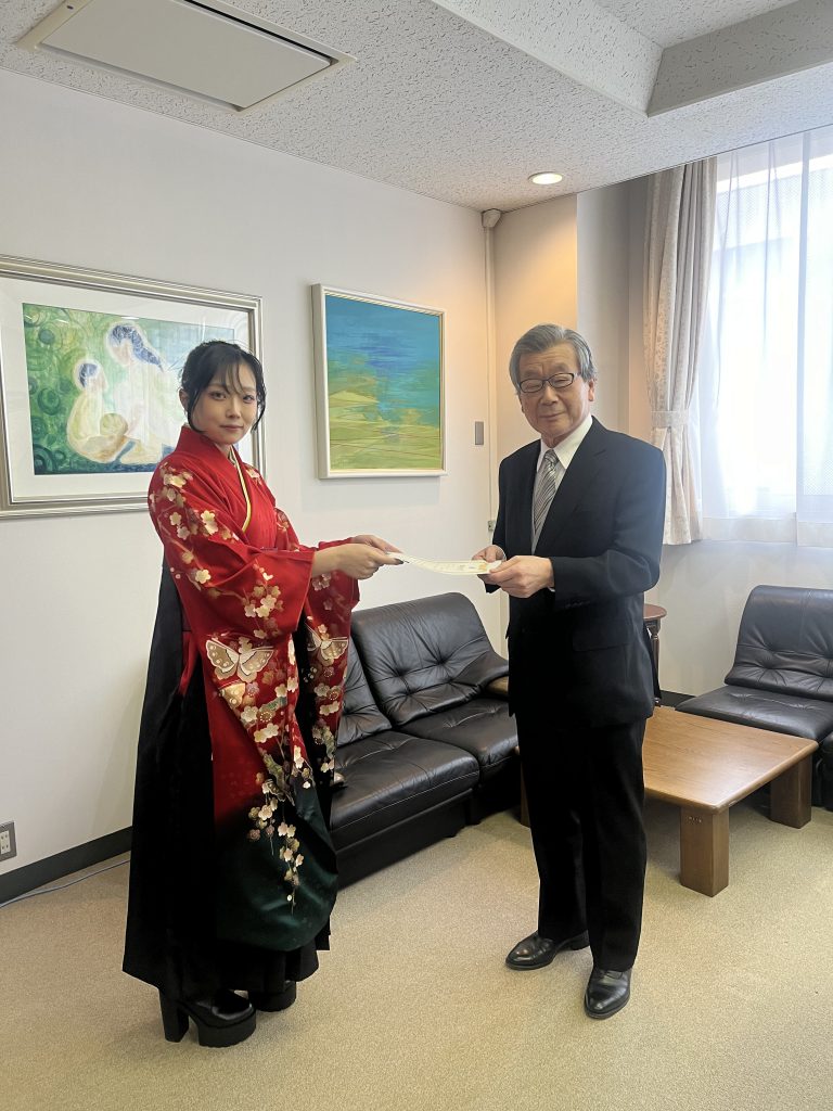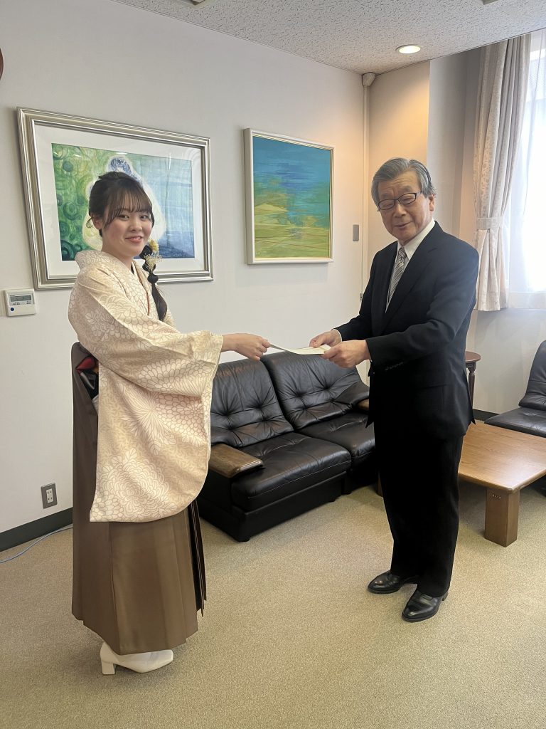 2023年12月に開催された「第15回 大学コンソーシアム八王子 学生発表会」において、看護学部4年生がポスター発表部門の準優秀賞を受賞しました。学内での表彰を2024年3月9日(土)の学位記授与式の日に学長室で行い、学長より表彰状と記念品を贈呈しました。おめでとうございます!