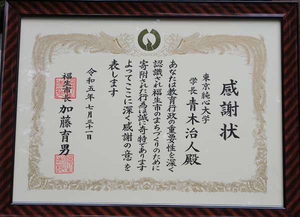 2023年9月11日、福生市教育委員会のご担当者様より感謝状を贈呈いただきました。公務多忙の中、本学までご足労いただき、誠にありがとうございました。