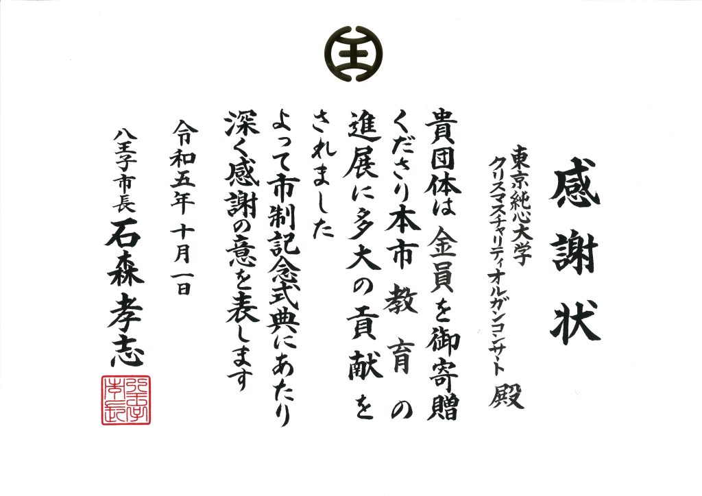 令和5年3月31日付で、クリスマスチャリティオルガンコンサートで寄せられたご来場の皆様からのお気持ちと、同時開催したJunshin Christmas Marketの収益を八王子市育英基金に寄附いたしました。この度、その寄附に対し、八王子市より感謝状を頂きましたので、ご報告いたします。
