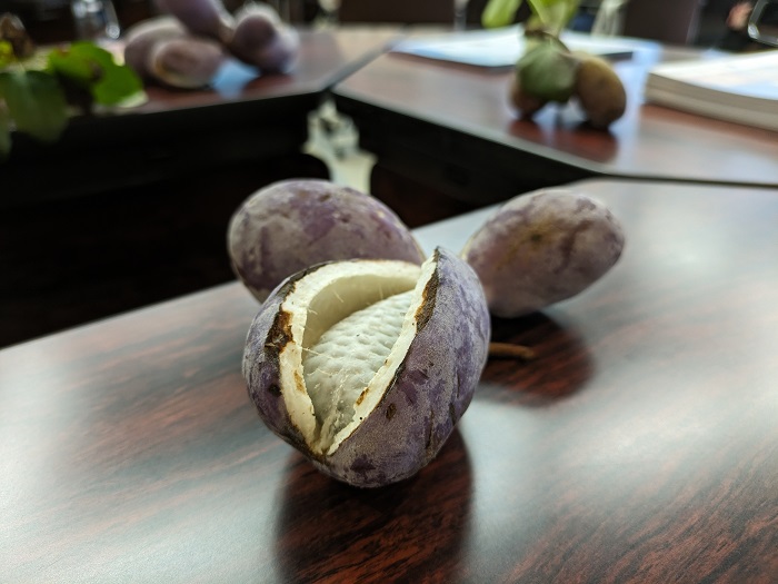会場には、地元で収穫されたアケビを飾りました。ちょうど実が割れて、熟したアケビは、ご来場の皆様に「いのちの息吹」として映ったようです。