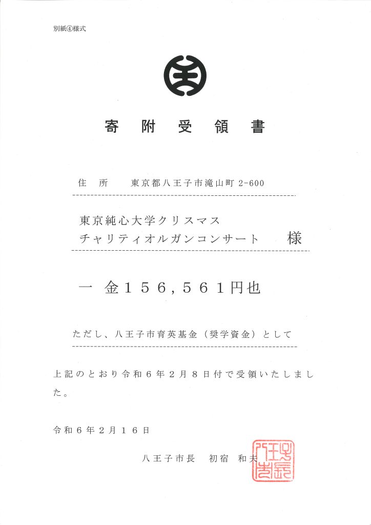 クリスマスチャリティオルガンコンサート2023で集まった募金と同時開催したJunshin Christmas Marketの収益156,561円を八王子市育英基金に寄附しました。写真は、八王子市からの受領証(令和6年2月8日付)です。お気持ちをお寄せいただきました皆様に心より感謝申し上げます。