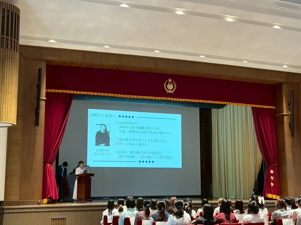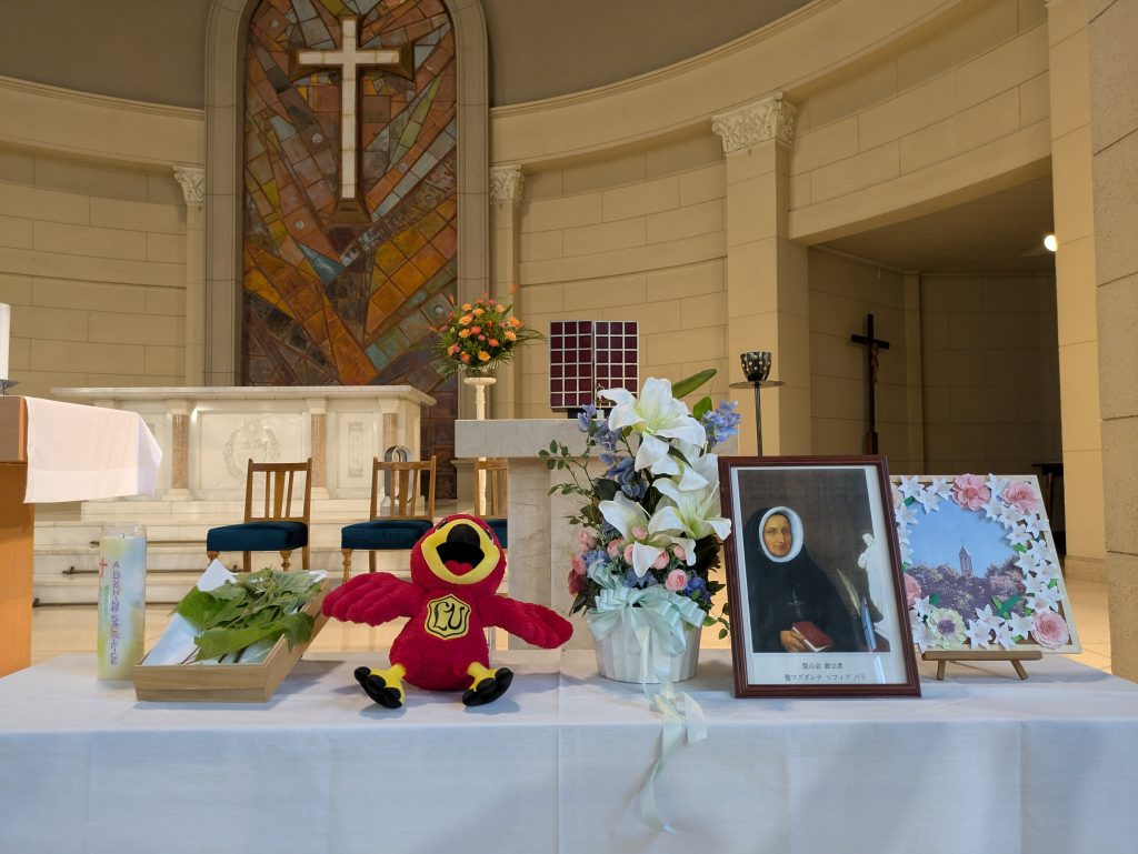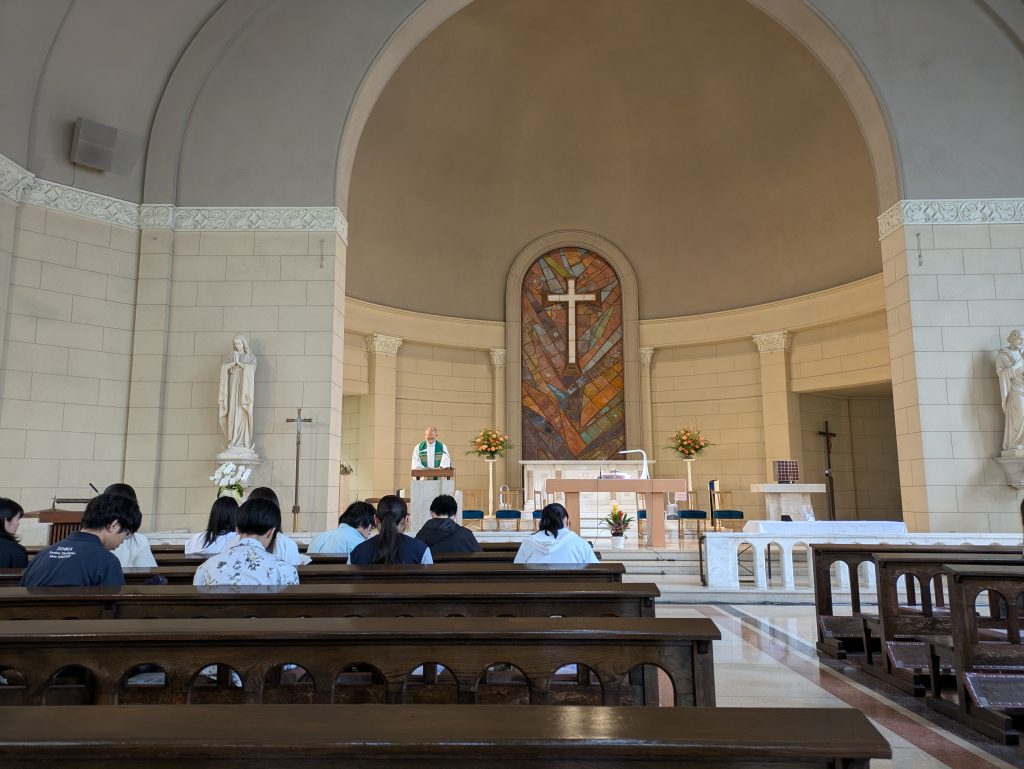 合同ミサの前には、上智大学と聖心女子大学の聖歌隊がリードしながら、歌の練習が行われ、心静かにミサの始まりを待ちました。ミサは、聖心女子大学リタジーサークルの学生の先唱で進行しました。増田健神父様を中心に5名の神父様による荘厳で温かいミサは、参列者の心を一致に導いてくださり、「主の平和」と互いに平和の挨拶を交わすころには心の通い合いを感じることができました。本学の学生も侍者として参加しました。各大学が準備した共同祈願で純心は被爆80年を迎えたことに触れ、平和の実現に向けて純心マッチの灯を広げていくことを祈りました。奉納では、各大学ゆかりの物が準備され、純心は昨年に続いてキャンドルを奉納しました。昨年は「純心マッチ」の歌詞とヒマワリの柄の組み合わせでしたが、今年は、「燔際の歌」とその歌詞に登場する白百合をカービングしました。
