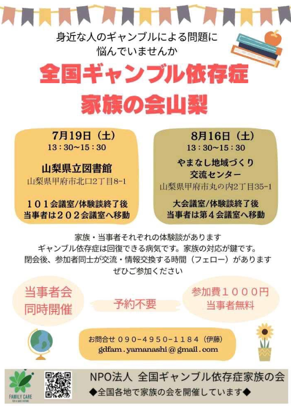 NPO法人全国ギャンブル依存症家族の会山梨主催のセミナーが7月19日(土)、山梨県立図書館にて開催されました。当日は、ギャンブル依存症当事者及びその家族が参加され、体験談の発表、参加者同士の交流や意見交換等を行いました。別科助産専攻教員3名は、貴重な内容を傾聴することができました。今回参加した内容は、2026年1月から行わるリカレント講座にて提供いたします。尚、今回は、一般社団法人パチンコ・パチスロ社会貢献機構様からの助成金で参加できました。厚く御礼申し上げます。