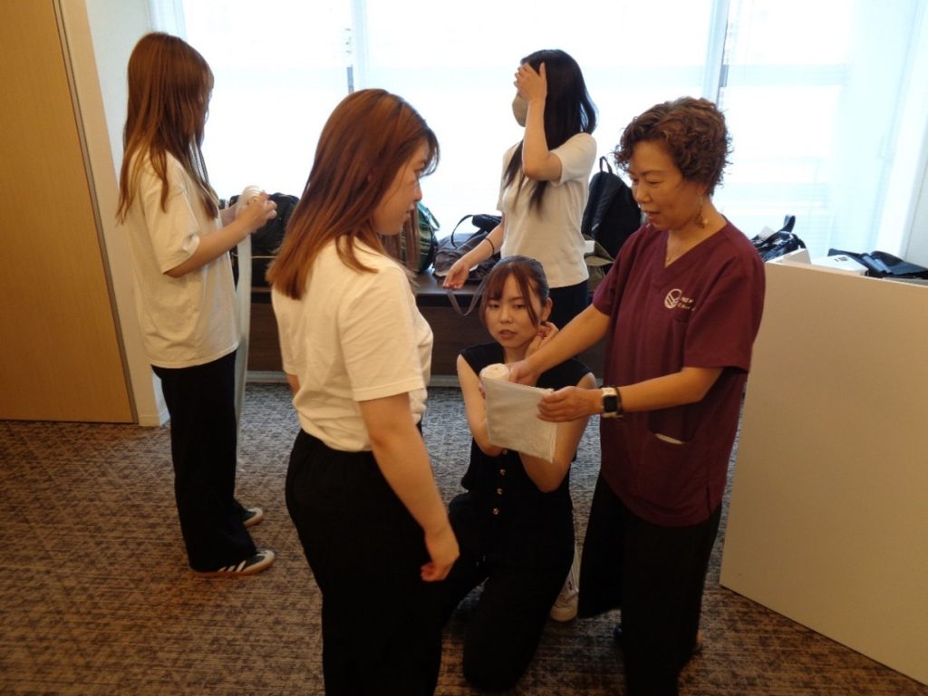 一方、助産師OBiの会に在籍されている3名の助産師の方々より、みすず帯の着帯指導を教授していただきました。学生たちは、体験することで興味をもって真剣に取り組んでいました。このような体験を通じて、学生は腹帯の機能的および文化的意義の双方について理解を深めるとともに妊婦の身体やそこに宿るいのちの重みを実感することができました。これにより、助産師としてのケアの実践に対する理解と妊婦への共感を一層深める貴重な学びとなりました。参加した学生の中から2名の感想を頂きました。