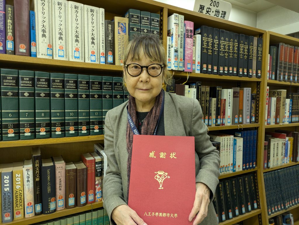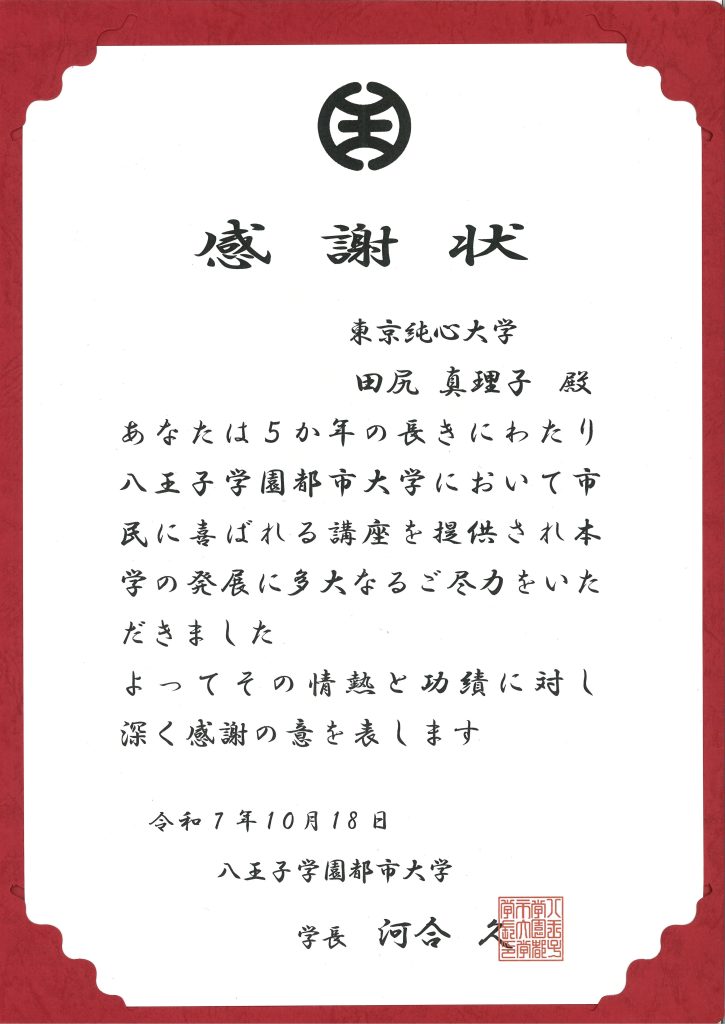 本学 キリスト教文化研究センター客員研究員・非常勤講師である田尻真理子が、八王子学園都市大学より、感謝状と記念品をいただきました。