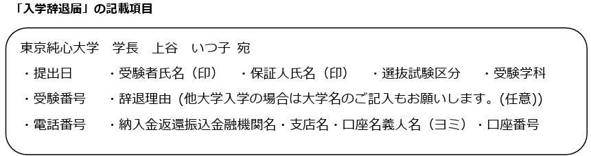 以下の項目の内容を記載した任意の「入学辞退届」と送付済の「入学許可書」を本学へ郵送してください。 納入された入学時納入金のうち、入学金を含め全額返還します(ただし、金融機関への振込手数料を差し引いた金額です)。 なお、後援会費については、別途後援会より返還いたします。