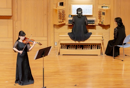つづく、学生によるユーフォニアムの演奏は深く温かな音色で会場を優しく包み込みました。この第一部では、ここからの4曲を「聖母マリアのものがたり」と題し、受胎告知からの聖母マリアの心を描く構成としました。オルガン講座受講生によるL.スミスの『Ave Maria』は純心が大切にしてきた旋律がオルガンで表現され、天の御使いの力強いメッセージを感じました。ラインベルガーの『プレリュード』と『カンツォーナ』は天日倫代先生のヴァイオリンとオルガンの二重奏で。聖母マリアの心の動きを繊細に描き出すお二人の演奏は聴衆を聖書の世界へと誘うようでした。締めくくりは、オルガン独奏のバッハの『マニフィカト』。厳粛な響きが、コンサートの歴史と気品をも伝え、第二部への期待が一層膨らむようでした。