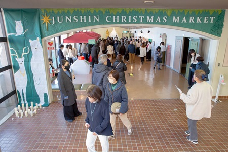 開場前と休憩時間に開催されたJunshin Christmas Marketも大変な賑わいとなりました。今年のBGMは学生によるピアノ演奏。チャリティ募金、ペットボトルキャップ回収、フードドライブ(食品回収イベント)、クリスマス絵本展示コーナーや、ハンドメイドショップが並び、和やかな賑わいとなりました。特に今年は、東京純心女子中学校・高等学校の生徒による手作り石鹸のお店「虹Soap」も参加し、沢山のお客さんが買い求めていました。また、今年は卒業生で書家の清水雅子さんによる臈筆を「清水雅子展 きっと、いい日」と題して展示しました。晴佐久昌英神父様による言葉が清水さんの書で表現された世界を多くの方がゆっくりと鑑賞されていました。