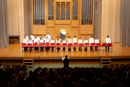 イエス様のお誕生を力強く伝えるイザヤ書がアンジェラ会の学生によって朗読され、クリスマスを祝うコンサートへと会場の雰囲気が誘われていきました。第一部のトップバッターを飾ったのは、ハンドベルとオルガンの合奏。ハンドベルとトーンチャイムの各々の個性が見事に響き合い、心温まるコンサートの幕開けを宣言するような演奏が、聴衆の心をつかみました。