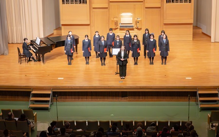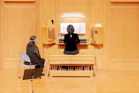 第二部は東京純心女子中学校・高等学校コーラス部による合唱からスタート。清らかな歌声が会場いっぱいに広がり、ご来場の皆さまも笑顔溢れる時間となりました。続くオルガンの独奏は、P. ヨンの『パストラーレ』。続いて、ヴァイオリンとオルガンの二重奏はお互いが見事に呼応しあい、厳かで華やかな旋律が江角記念講堂に響き渡りました。2曲目は神の深い愛と温かさを存分に表現したコレッリの『パストラーレ』で締めくくられました。