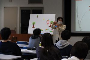 パイプオルガンの演奏後は、学生たちによる手遊びを行いました。歌に合わせて、手を動かし、会場が今度は明るく、温かい雰囲気に包まれました。