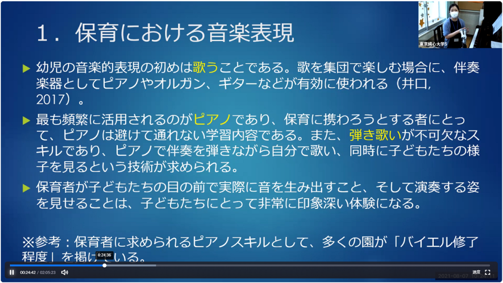 「こどもと音楽表現」の授業では、保育士・幼稚園教諭養成課程で学ぶピアノについてお話がありました。幼稚園教諭、保育士の先生には、子どもたちの様子を見ながら、必要に応じて適切な曲(生活の歌、行事の歌、季節の歌 等)を選び、伴奏を弾く力が必要になります。こども文化学科では、こどもの歌のレパートリーをできる限り多く身につけられるよう学びます。本学では「入学前学習プログラム」があり、希望された方は入学前から個人レッスンを受けることもできます。
