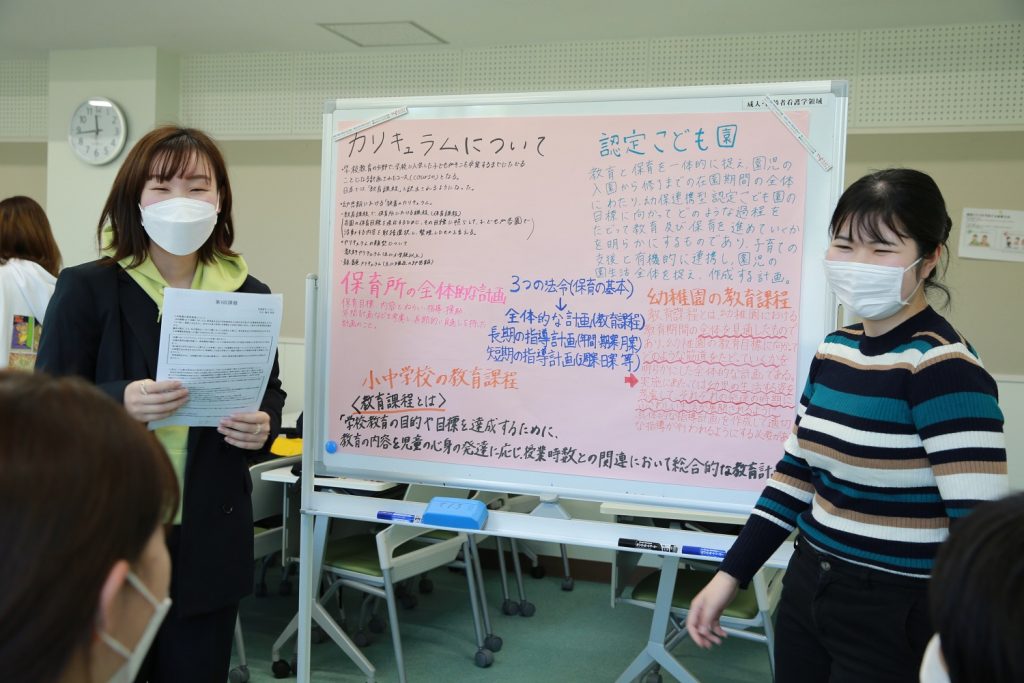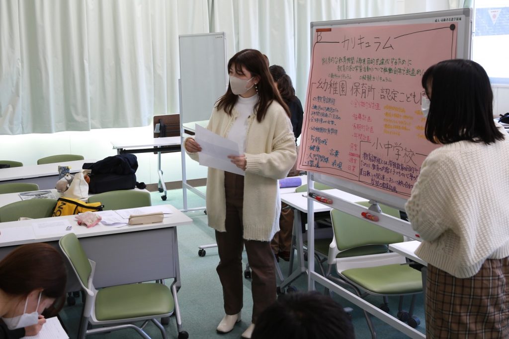 10月19日の授業では、4~5人ずつに分かれてグループワークを行いました。幼稚園、保育所、認定こども園、小中学校の教育の内容や方法について、一人一人が調べた内容を持ち寄りグループで話し合い、さらに理解を深めました。