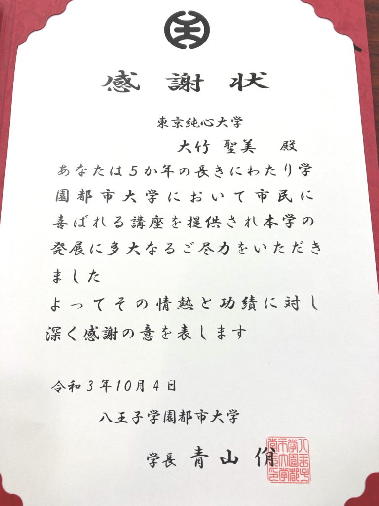 その情熱と努力に八王子市学園都市大学の青山佾学長から感謝状が贈呈されました。今後も市民のみなさまに喜ばれる講座を開講して参ります。