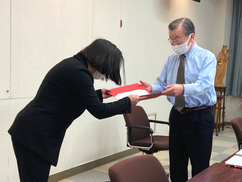 新型コロナウイルス感染拡大に伴い、八王子市学園都市大学による授与式は執り行われないため、10月27日に本学の青木治人学長より、感謝状が手渡されました