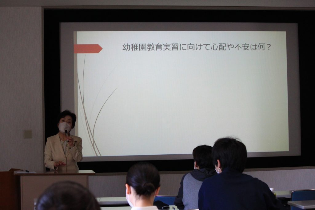 授業を受けて、実習に対してより一層気持ちが高まったのではないでしょうか。まもなく幼稚園教育実習を迎えますが、授業でお話いただいた学びを活かして実りある教育実習にしていただきたいと思います。