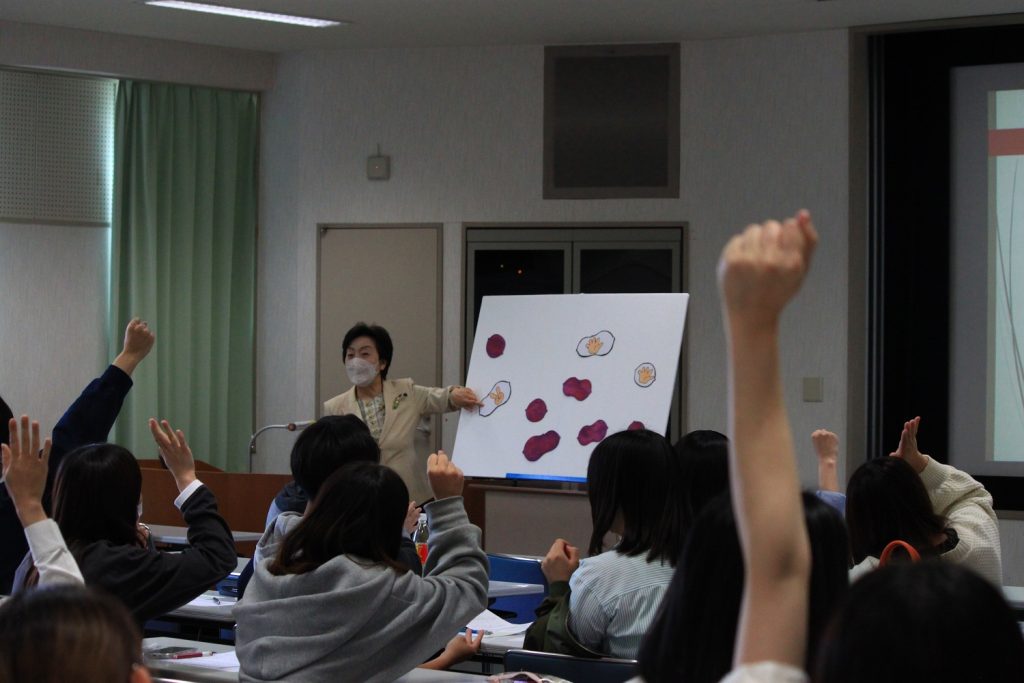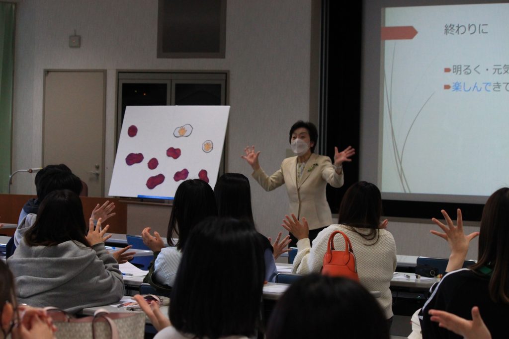 永井先生がパネルシアターを使って手遊び歌を歌うと、学生の皆さんも自然と手遊びに参加していました。