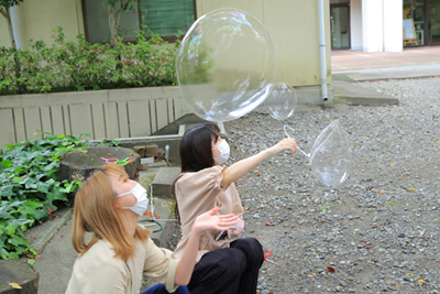 じめじめと本格的な梅雨が東京純心大学にも訪れています。その梅雨の貴重な晴れ間のタイミングで「造形基礎I」では毎年恒例のシャボン玉を体験する授業を実施しました。
