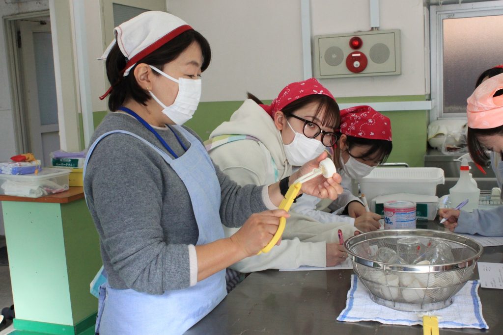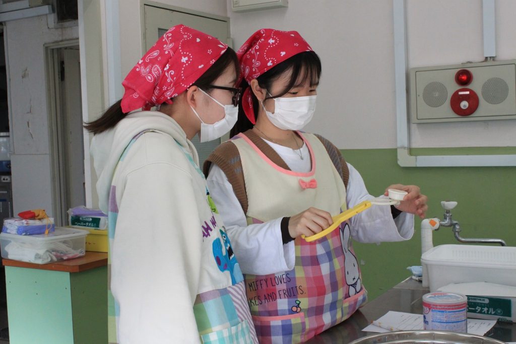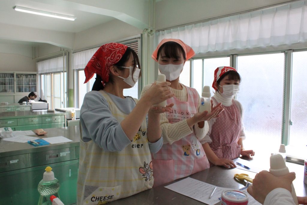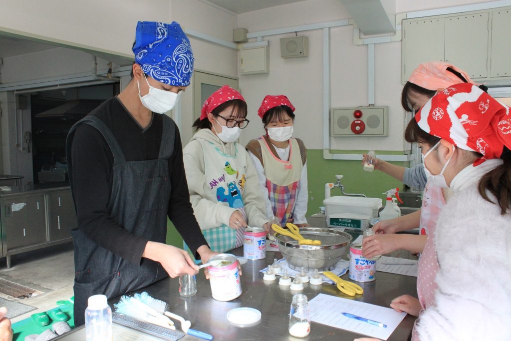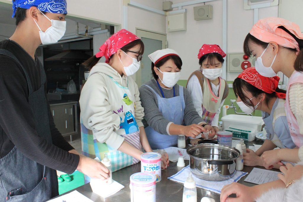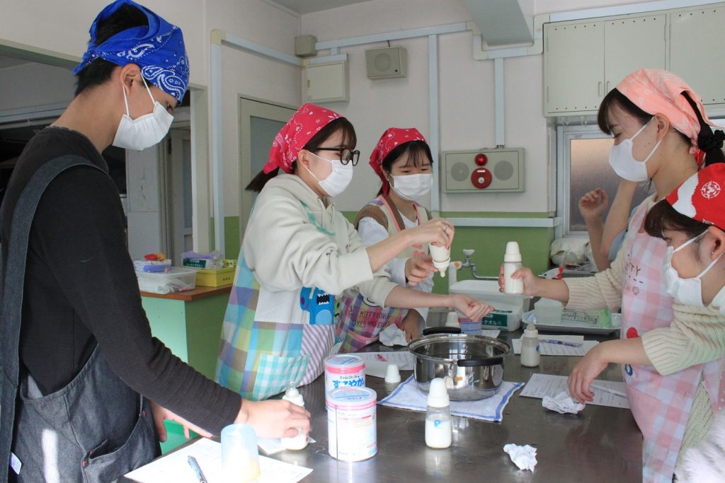 本日は授業「子どもの食と栄養B」の様子をご紹介します。こちらは授業「調乳」の様子です。「無菌操作法」を学びました。