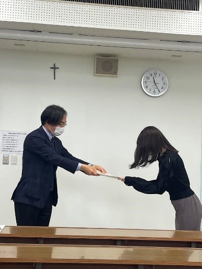 ピアヘルパーは、教育・保育などの現場で人とかかわるために、カウンセリングや心理学に関する知識を身につけた者であることを証明する資格です。本学科で開講する所定の科目の単位を修得し、試験に合格した4年次生2名に合格証が授与されました。