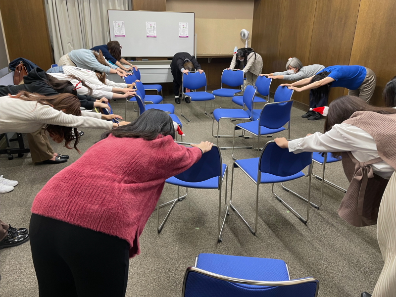 松原昌代先生は、日頃から多くのがん患者さんにリラクゼーションを提供されている方です。参加者のからだと気持ちがほぐれるように、ヨガを教えていただきました。ヨガでからだの心地よさを感じると、気持ちもほぐれ、ゆるゆる、ほんわかした気持ちになっていくのを感じました。