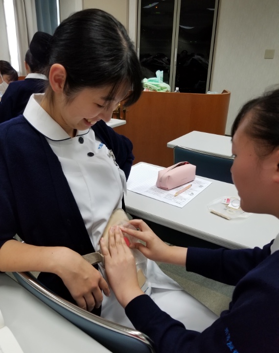 看護の知識を修得するための「ヘルスアセスメントと援助Ⅲ」は2年生の後期で学びます。その中で、看護に必要なアセスメント項目の一つである「排泄」を学びます。今回の演習では、治療のために生理的な排泄が困難となり、ストーマ(人工肛門)を造設した患者さんを理解するために、ストーマケア、パウチ貼付の演習を行いました。