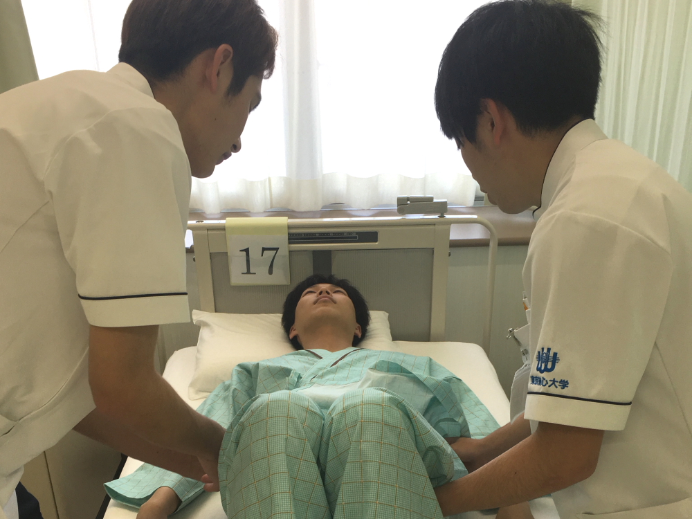 「看護技術演習Ⅰ」は入学して間もない4月から始まる科目です。初めは看護の対象者と医療者の安全を守るための「手洗い・感染予防」「環境の調整」、信頼関係を深めるための「コミュニケーション」を学び、その後、「シーツ交換」「体位変換」「寝衣の交換」「移動・移送(車椅子やストレッチャー)」など、病いを抱えた方が必要とする日常生活の援助技術を習得していきます。
