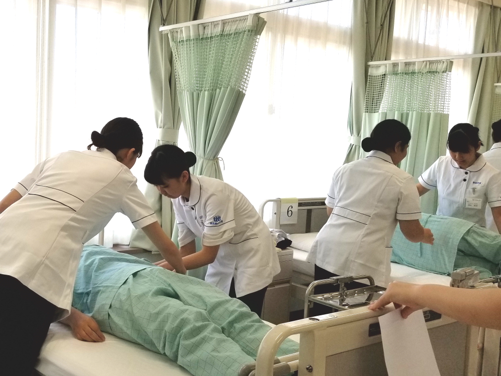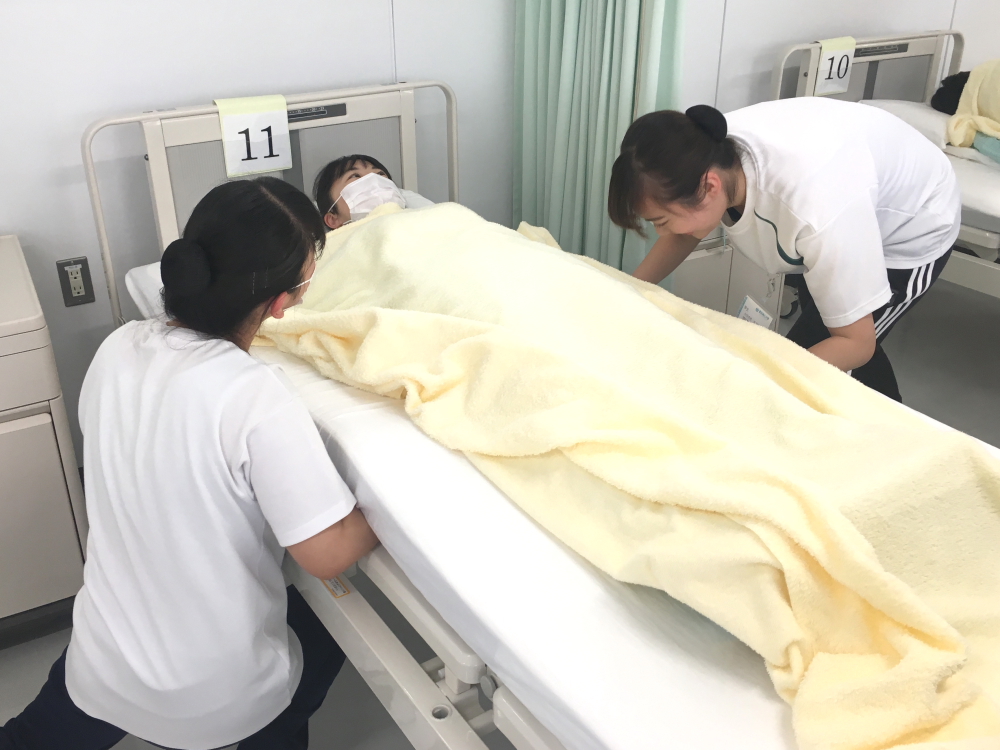 演習では、看護師役だけでなく患者役も体験することで、どういうことが患者さんの安心や安楽につながるのか、安全に行うためにはどうすればいいのか自ら考える機会となります。普段はデモンストレーションやDVDで確認した手順どおりに行うことで精一杯ですが、演習の最終日にはリフレクション(振り返り)として、「臥床患者さんの寝衣・シーツ交換」の課題に取り組みました。自分たちで援助方法を考え、いろいろなアイデアを出し合い、工夫しながら演習しました。