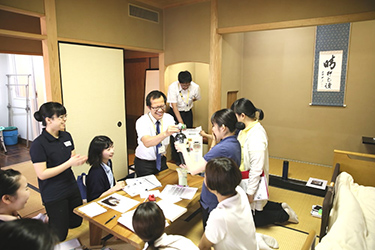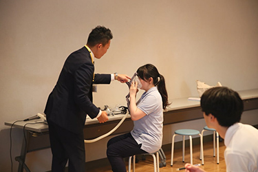 在宅酸素療法は、慢性呼吸不全のため日常生活に酸素吸入が必要な方が自宅にいながら行う治療法です。学生は鼻カニューラ(酸素を流して鼻から吸えるようにした管)をつけて酸素吸入をしながら屋内を移動する等の体験をしました。(下記写真)