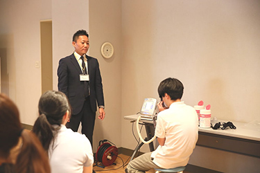 人工呼吸器のマスクの装着を体験した学生は、「鼻マスク式人工呼吸器を実際に装着してみて患者の不安や苦痛に対して身をもって知ることができた」、「鼻マスクをつけていることだけで圧迫感を感じた」などの感想を述べていました。在宅酸素療法や在宅人工呼吸療法を導入する療養者の方への看護は、機器の取り扱いだけでなく、苦痛なく酸素吸入が継続できるような具体的なアドバイスや機器装着の不安などの精神面での支援が必要であるということを、体験を通して学ぶことができました。