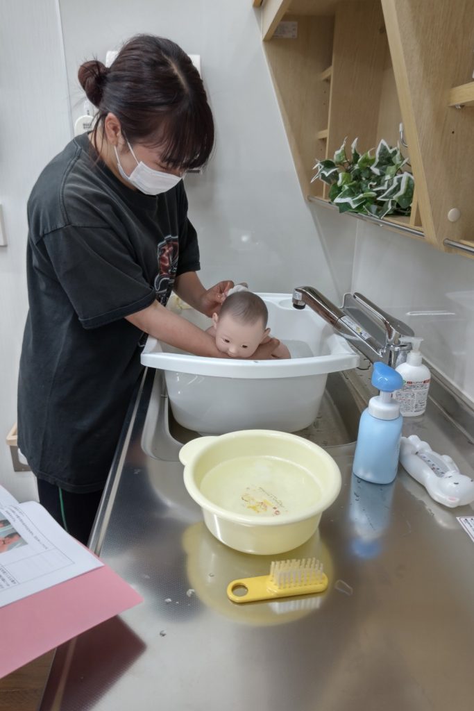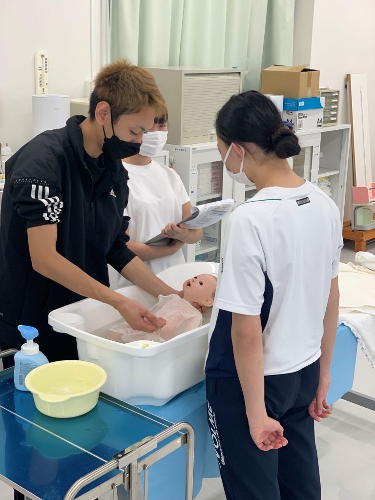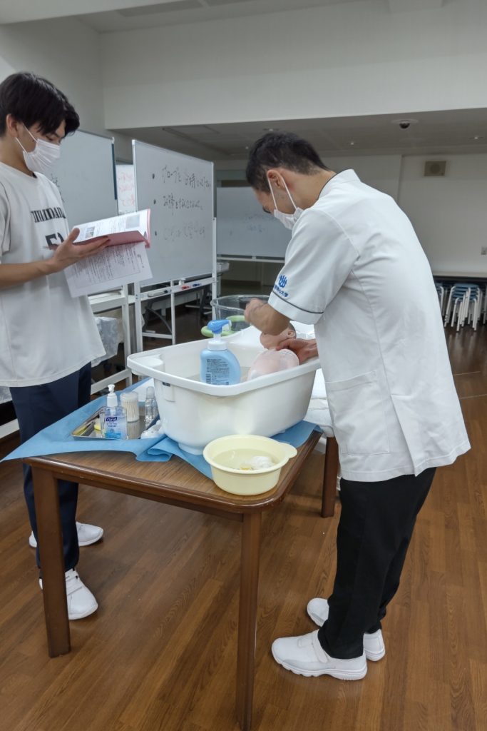 母子演習室には、病院にあるような沐浴漕もあるのですが、昨年度に引き続き「退院後の生活を想定した沐浴方法」をテーマに10月17日(月)地域・在宅 看護学実習室と母子看護学実習室で演習を実施しました。