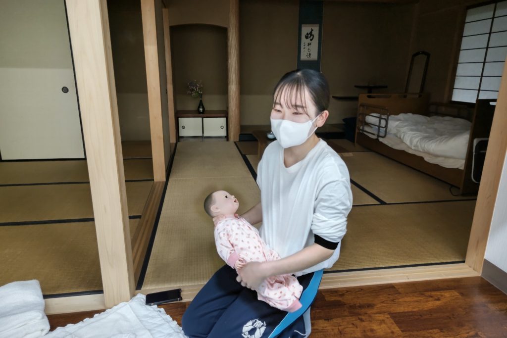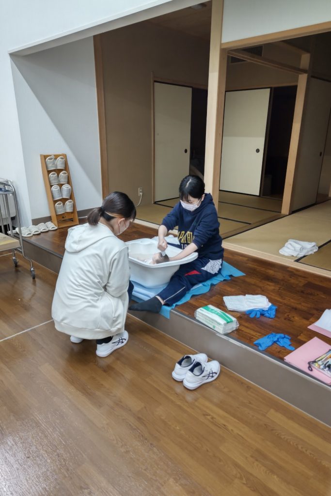 地域・在宅看護学実習室では、退院後の自宅での沐浴を想定し、ダイニングテーブルやシステムキッチン流し台、フロアの3カ所を使用しました。母子実習室では、テーブルの上に置いたベビーバスを使用しました。手順通りに実施することに気がとられ時間がかかりすぎてしまった学生に「これでは、赤ちゃんの体力を消耗させてしまう。お湯も冷めてしまうから5分以内でできるように練習しよう。」と助言する学生や、「1回実施しただけで腰が痛くなった。本物の赤ちゃんは動くだろうし毎日やるとになると大変。」などの声も聞かれました。一方では「これからお風呂にはいりますよ~。」と自然な声掛けをする学生もいて教員たちは、微笑ましく演習を見守ることができました。