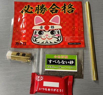 教職員一同からは、必勝グッズと「滑らない砂」が手渡され、「試験当日忘れずに持って行こう」との声が聞かれました。