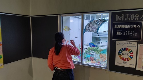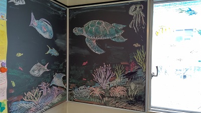 図書館第3閲覧室へ向かう階段の壁面は黒板になっており、学生の作品展示やインフォメーションボードとして利用しています。今回、その一角に水族館が登場しました。「保育内容演習・表現」の授業を担当されている松澤綾子先生による黒板&ガラスアートです。マンタやウミガメ、カラフルなイソギンチャクの森には隠れクマノミが泳ぎます。見るたびに発見があり、暑さを忘れる涼やかな海中の光景です。この場所は採光窓が小さいこともあり、それがかえって水族館らしさを演出しているようです。