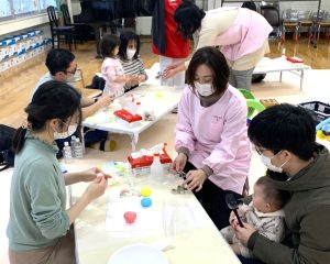参加者は妊娠中期~後期の妊婦さんとご家族、3~5か月の乳児とご家族で、合計8組16名でした。スタッフは学生ボランティア3名(こども文化学科3年生2名、看護学部1年生1名)、教員3名、助産師3名で感染対策のもと、お手伝いをさせていただきました。