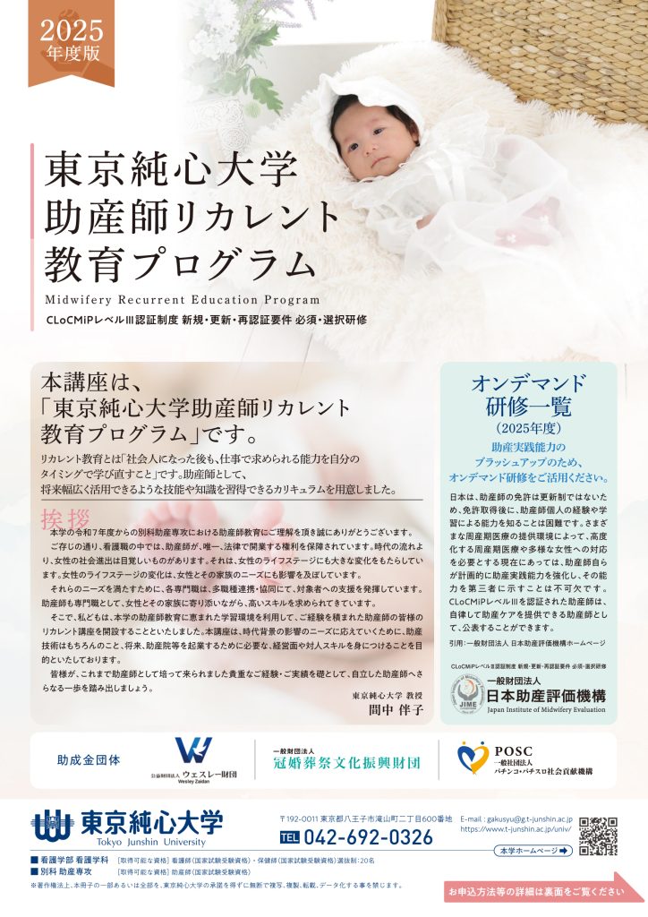 本学では、すでに助産師の資格を持ち、自律した助産師としてさらに能力を高めたいと考えている方、再び教育を受ける必要性を感じている助産師の方のために「リカレント教育プログラム」を開講いたします。